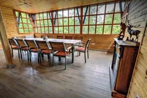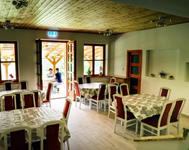 Földszinten közösségi helyiség, közvetlen fedett terasz kapcsolattal. Alkalmas étkezésre, előadások, foglalkozások csoportos programok megtartására. Emeleti részen kisebb társalgó ami akár meghitt családi, baráti beszélgetések helyszíne is lehet. Házban ingyenes wifi használati lehetőség.