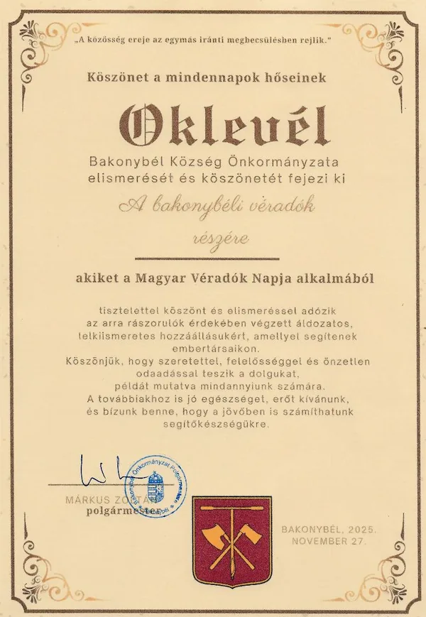 Nem tesz másképp a mai napon Bakonybél Község Önkormányzata sem, ezúton fejezi ki köszönetét az alábbi oklevéllel a magyar véradóknak, köztük kiemelten a bakonybélieknek!