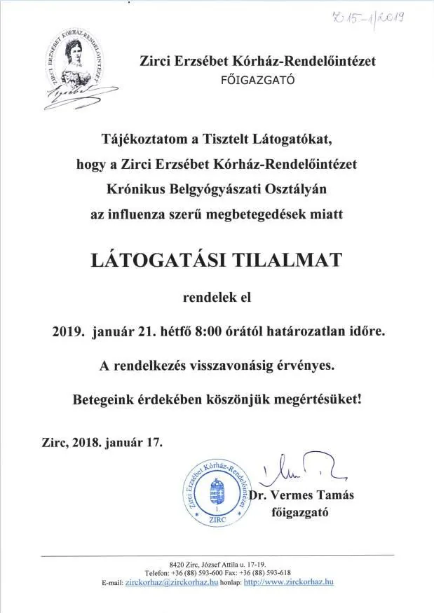 Tájékoztatom a Tisztelt Látogatókat, hogy a Zirci Erzsébet Kórház-Rendelőintézet Krónikus Belgyógyászati Osztályán az influenzaszerű megbetegedések miatt