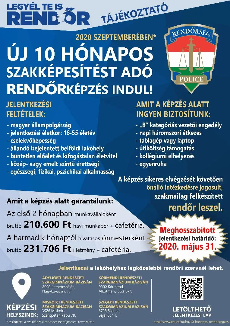 A 10 hónapos képzésünkre történő jelentkezéssel élethivatást is választasz, és leendő szolgálati helyeden változatos szakterületeken teljesíthetsz majd szolgálatot! A rendőrséggel hosszú távra tervezhetsz, még akkor is, ha most nem ez lebeg a szemed előtt.