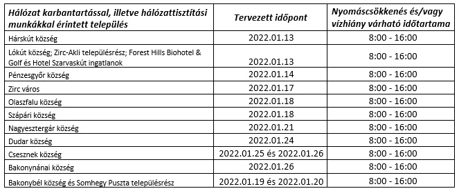 Ezúton tájékoztatjuk Önöket, hogy hálózat karbantartási és tisztítási feladatok végzése miatt, esetleges nyomáscsökkenés illetve időszakos vízhiányok várhatóak a Zirci Üzemmérnökség alábbi táblázatban található településein: